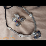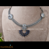 The Kamala Necklace adorned with a cluster of Kempu stones resembling a Kamala or a Lotus with Godess Lakshmi in Temple Jewellery style. This beautiful Necklace Is made in pure 92.5 silver . Our Silversmith has used a handmade or a handwoven chain to put all the pieces together to form a Antique Necklace. This beautiful necklace is a must in your collection.