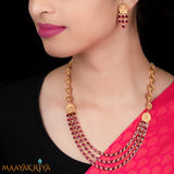 Surabhi is an exclusive multilayered red stone Lakshmi necklace .