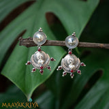 Simple but an elegant 92.5 Silver Oxidized Chandrabindu (Moon dot) Earrings with kempu stones at the bottom and real fresh water pearls hanging in the middle of the Earrings gives a spectacular look when worn.