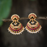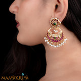 One of the most traditional 92.5 Silver Handcrafted Lotus Earrings finished with Gold Polish , kempu, white , pache stones and real fresh water pearls at the bottom of the Pundarika or the lotus flower will be best suited for all your traditional attires.