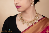 This Ananda Vajra Necklace set looks elegant for those evening wedding or other parties . The White cubic Zircons are highlighting the Jewellery and the fresh water pearls strung below adds elegance to you and the Jewellery. This is beautifully handcrafted in pure 925 silver and polished in 24karat Goldpolish.