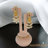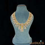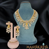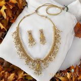 Elevate your traditional look with our elegant Pushpadharini Guttapusalu Necklace Set. Featuring shimmering white cubic zircons and a beautiful sitting Lakshmi design, this necklace set adds a touch of sophistication to any outfit. Perfect for special occasions or everyday wear.