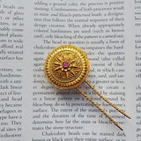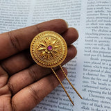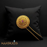 This elegant Maayakriya hair pin is crafted from pure 92.5 silver and finished in antique gold tone. Shaped like a blooming flower with layered petals and a central gemstone, it radiates timeless charm. Perfect for traditional buns or festive hairstyles, it adds a graceful vintage touch to your look.