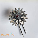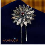 Enhance your hairstyle with this elegant 92.5 silver hair pin, designed in a traditional floral pattern. Featuring intricate petal detailing and a striking red stone at the center, it brings a perfect mix of vintage charm and grace. Ideal for festive occasions, classical wear, and ethnic styling.