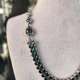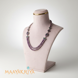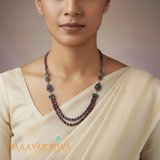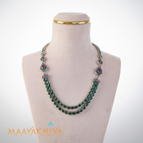 The Anvitha Necklace is a stunning double-layered, double-sided design that showcases the rich warmth of kempu stones on one side and the verdant elegance of pacche stones on the other. This versatile piece allows you to switch between two distinct looks, offering maximum style flexibility for any occasion. Crafted with precision, the contrasting gemstones create a captivating visual balance that celebrates both tradition and contemporary design sensibilities.