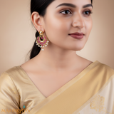 The mango(amra) shaped motifs made of Sterling Silver 92.5% with Kempu stones have been joined to form a moon shape and rice paerls hanging at the bottom gives a enticing look to this piece of jewellery.