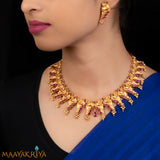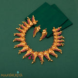 Peacock motifs delicately joined together to make this pretty handcrafted Silver necklace set polished in 24karat gold . Wear it with any colour Silk Saree and this necklace will definitely make you a highlight in any occasion.
