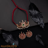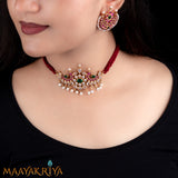 This Choker and earrings are finely made in 92.5% pure silver with 2 peacocks flaunting their beauty . The Kempu/pache and white cubic Zircons are adding glory to this Jewellery.
