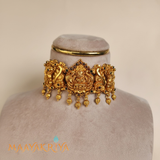 The Shrivalli Kempu Choker features a graceful seated Lakshmi at its heart, complemented by delicate flower motifs that bloom along the sides. Rich kempu stones enhance the piece with their warm, radiant glow, creating an aura of divine elegance and prosperity. The intricate floral designs add botanical charm while maintaining the spiritual essence of this devotional accessory. Perfect for festive gatherings and sacred occasions, this choker merges artistic craftsmanship with meaningful symbolism in a truly captivating way.